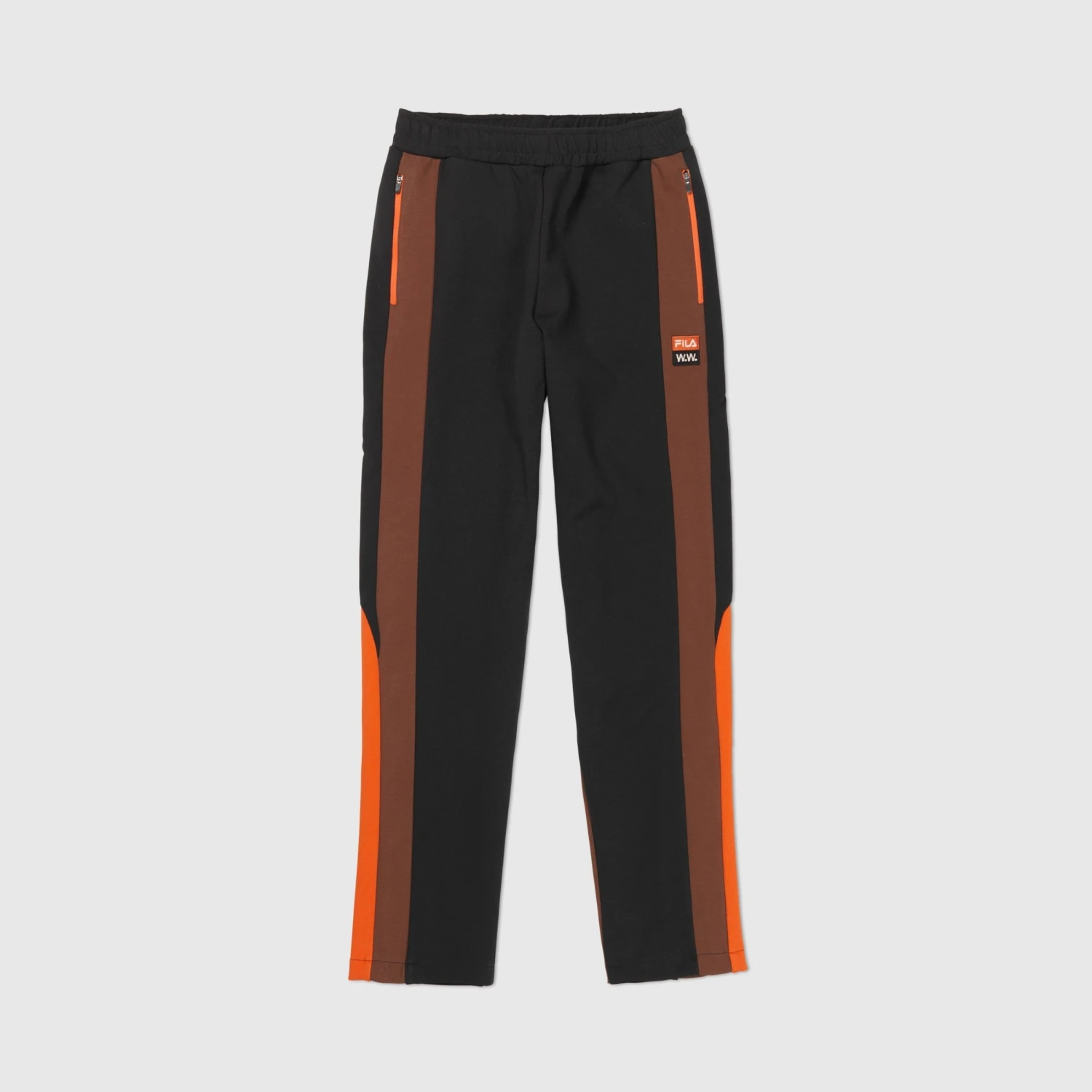 Die Karolina Track Pants erinnert äußerlich nicht nur an traditionelle Sportswear, sondern vor allem an klassische Tenniskleidung. Der gerade Beinschnitt, ein elastischer Bund und die kontrastierenden Einsätze in Orange und Braun verleihen der Hose einen unverkennbaren Vintage Look. Auf dem linken Bein befindet sich eine Stickerei des FILA by Wood Wood Logos. Passend ergänzt wird das Outfit mit der Evonne Track Jacket.